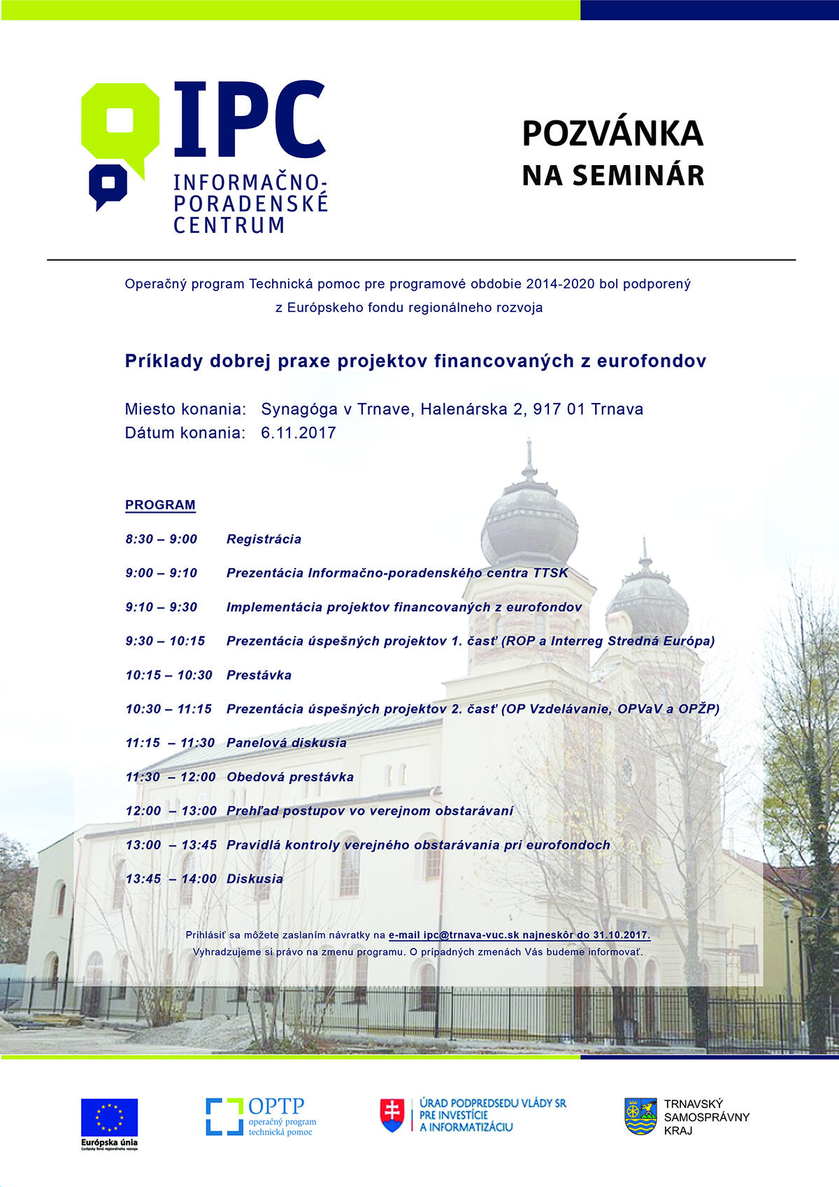 Informačno-poradenské centrum Trnavského samosprávneho kraja Vás pozýva na seminár „Príklady dobrej praxe projektov financovaných z eurofondov“, ktorý sa uskutoční dňa 6. novembra 2017 v Synagóge v Trnave. Na seminári budú prezentované úspešné projekty realizované v programovom období 2007-2013. Prihlásiť sa môžete zaslaním návratky na e-mail ipc@trnava-vuc.sk najneskôr do 31. októbra 2017.